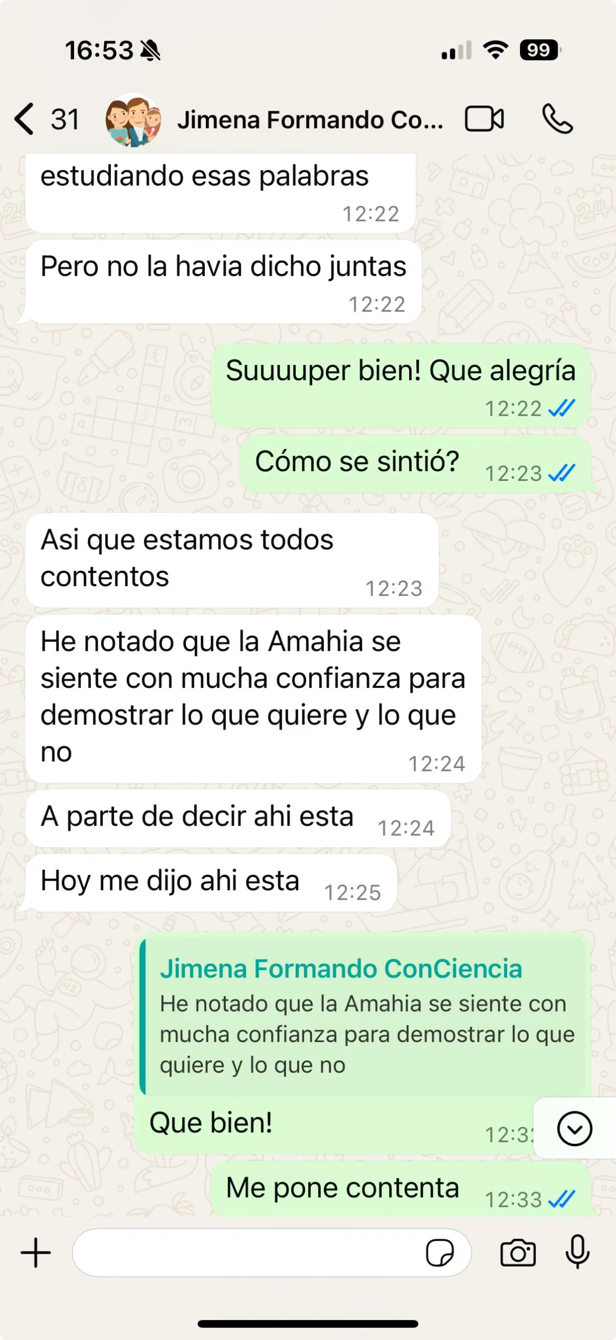 Desde el comienzo hasta ahora, hemos aprendido 5 palabras funcionales y, sobre todo, adopté el conocimiento para mí, mi mamá y mi hermano, que son los que más comparten con la niña. Hemos podido debatir en familia las mejoras que tenemos que tener.