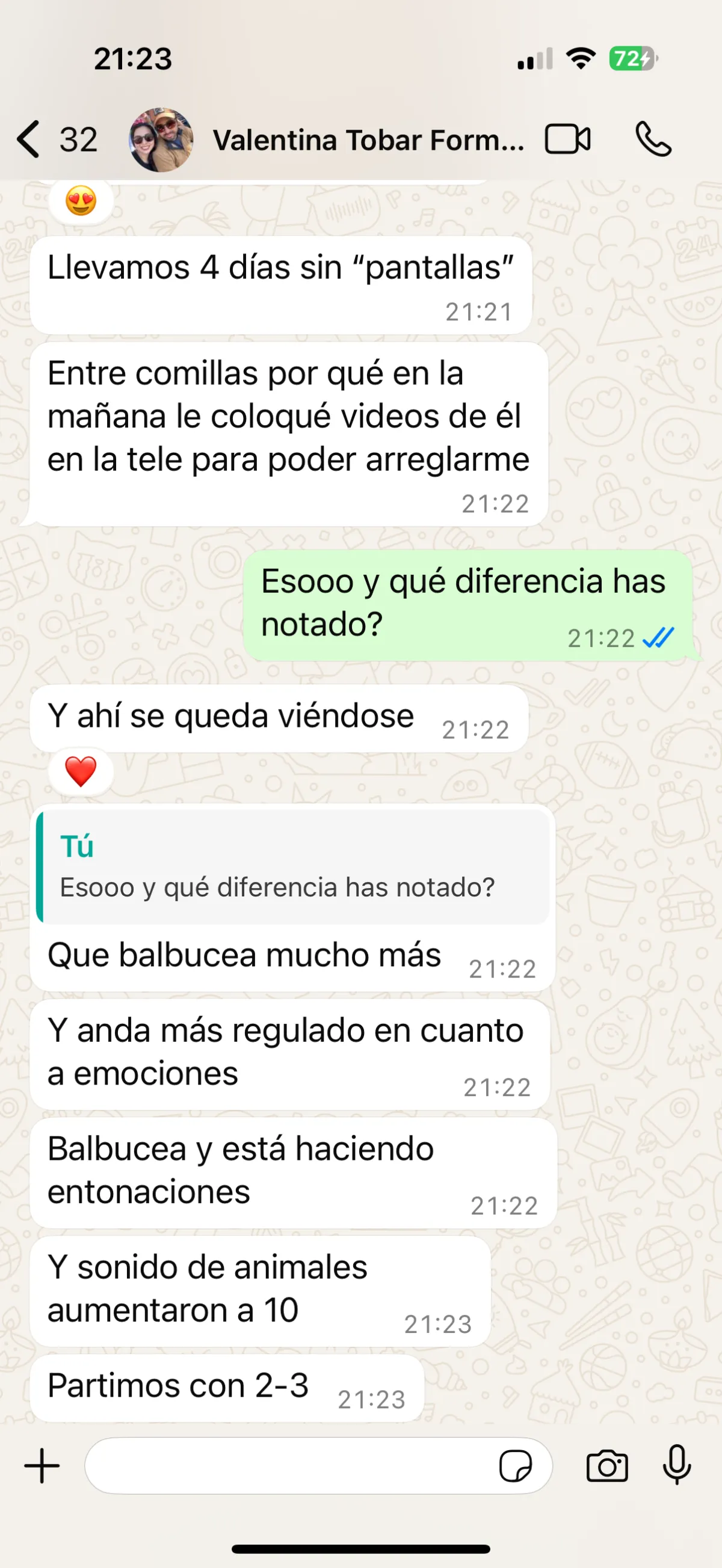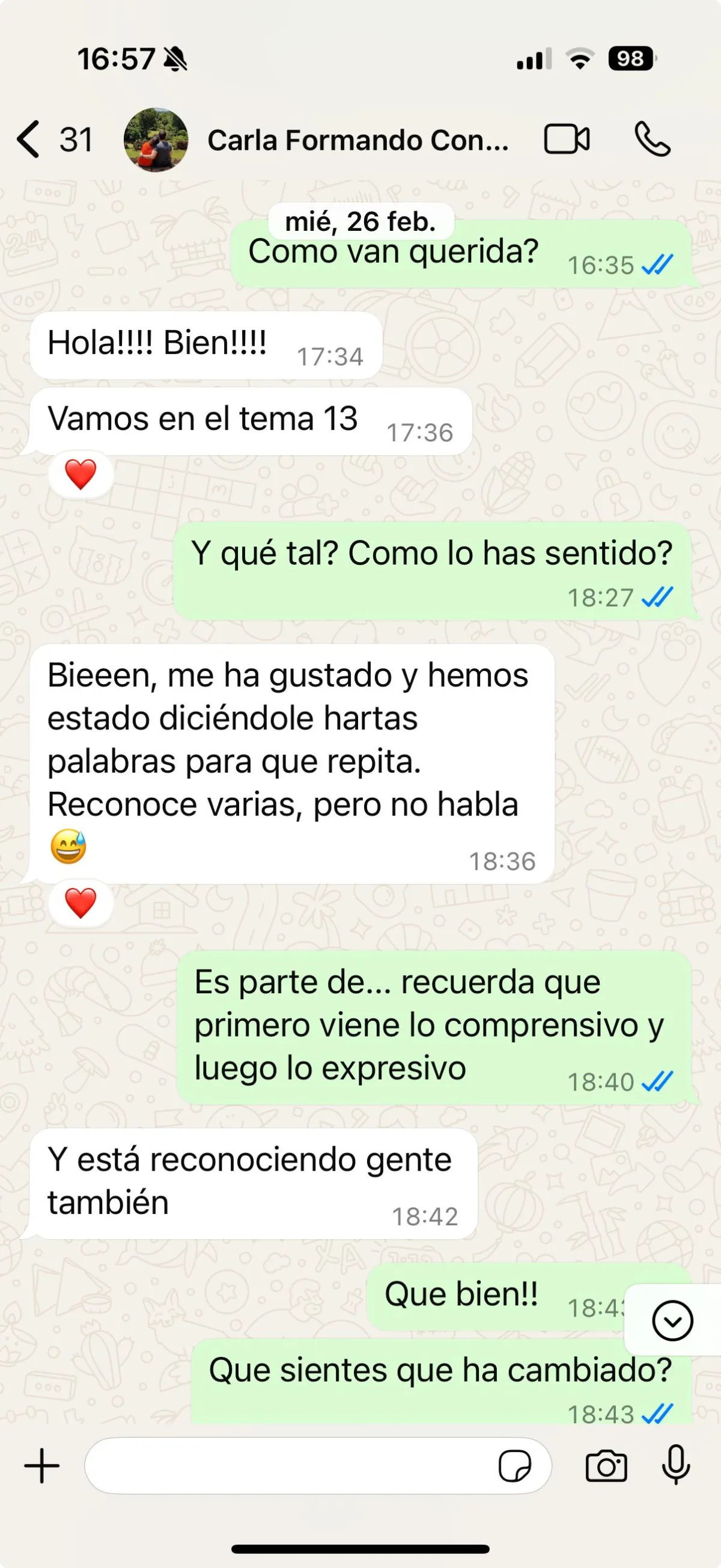 Al entrar al programa, teníamos 8 palabras y desbordes emocionales (berrinches). Al día de hoy, con 2 meses, llevamos 36 palabras, ya hacemos combinaciones de 2 palabras, controlamos sus desbordes emocionales y somos más independientes.