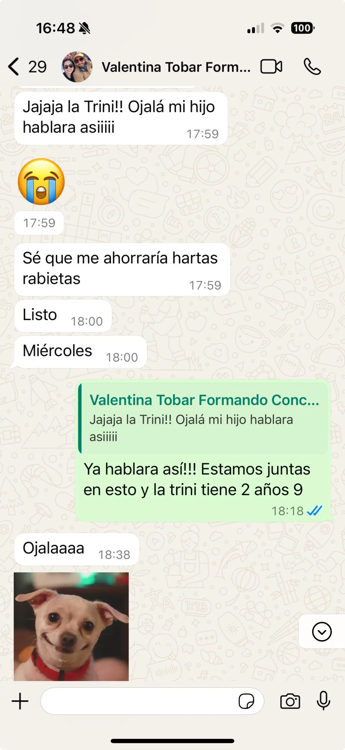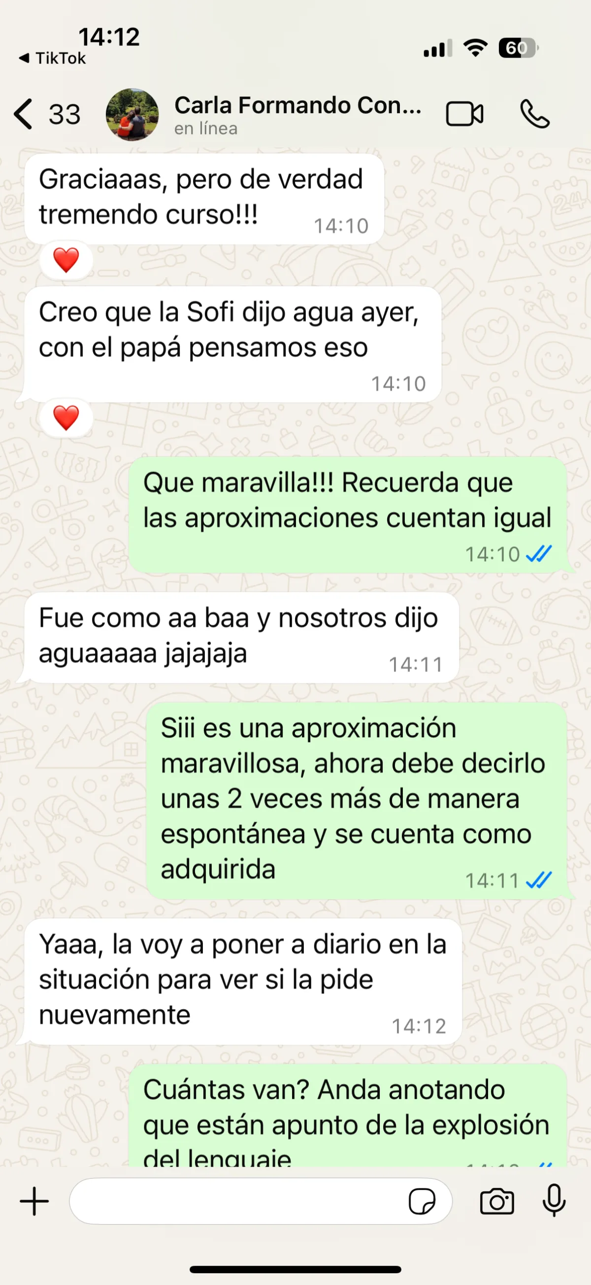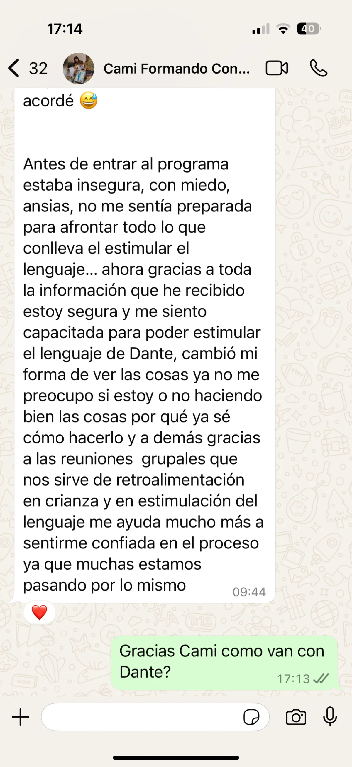 "En solo 3 semanas pasó de 8 a 20 palabras. Aprendí a manejar rabietas y a criar de manera respetuosa, sintiéndome acompañada y apoyada en todo momento.”